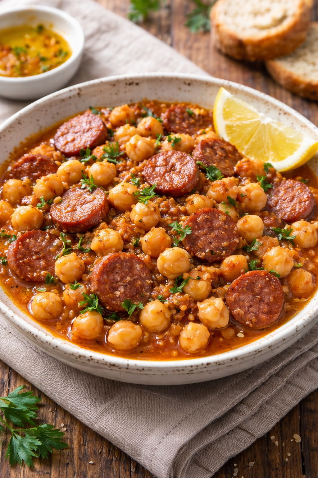 - Προσθέτουμε στα ρεβίθια το μίγμα με τα λουκάνικα και μαγειρεύουμε για ακόμη περίπου 10 λεπτά, να εξατμιστούν τα πολλά νερά.